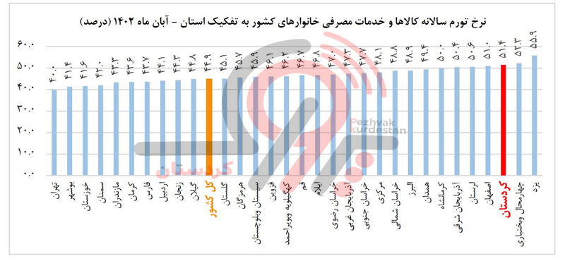 دوم) مرکز آمار ایران هم در میانه هفتهای که گذشت گزارش شاخص قیمت مصرفکننده آبان 1402 را منتشر کرد؛ کردستان در تورم نقطه به نقطه استان دوم کشور و در نرخ تورم سالانه استان سوم کشور معرفی شد.