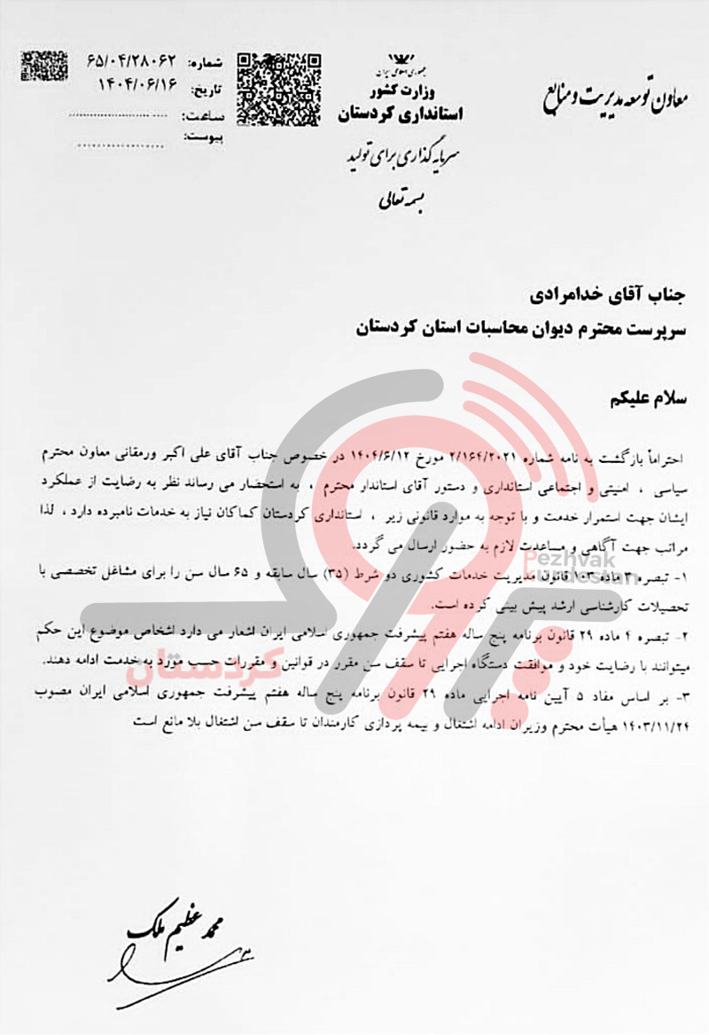 پاسخ فاقد وجاهت معاون توسعه منابع استاندار کردستان به نامه دیوان محاسبات درباره بازنشستگی «ورمقانی» + عکس