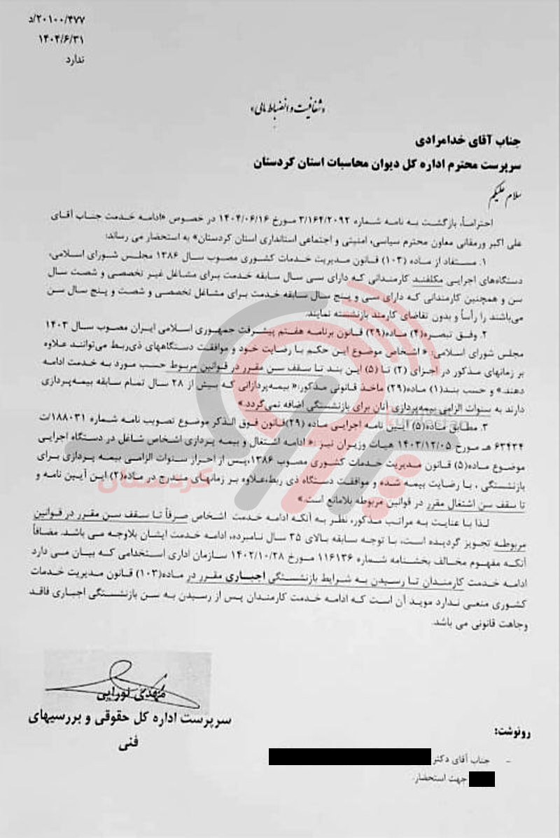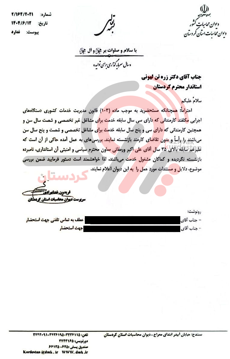 سرپرست اداره کل حقوقی و بررسیهای فنی دیوان محاسبات با برشماری چند دلیل قانونی، ادامه خدمت «علیاکبر ورمقانی» در سمت معاون سیاسی، امنیتی و اجتماعی استاندار کردستان را «بلاوجه» اعلام کرده است؛ اینکه چرا با وجود اظهار نظر صریح دیوان و وجود موانع قانونی برای ادامه خدمت «ورمقانی»، این فرد بازنشسته نمیشود سؤالی است که «آرش لهونی» و دولت وفاق باید به آن پاسخ دهند.